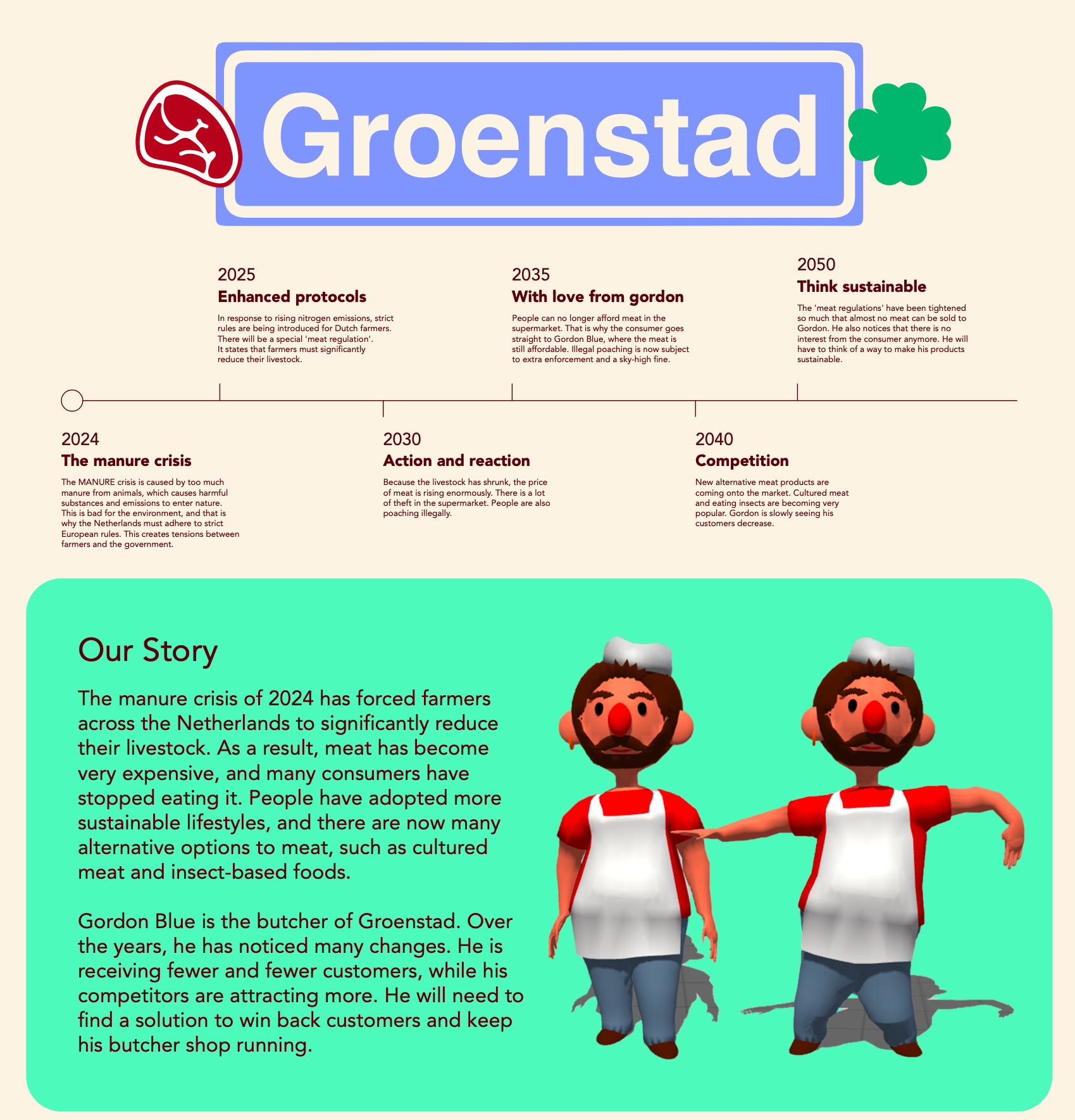 My team and I designed this game based on a project by the Netherlands Environmental Assessment Agency (Planbureau voor de Leefomgeving) that focused on spatial planning for the year 2050. We specifically explored the transformation of the bio-industry and the shifting societal attitudes toward meat consumption.